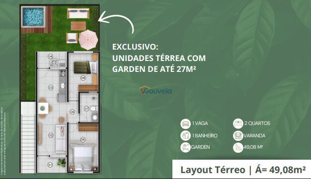 - Unidades de 2 quartos com varanda, 49,08 m², 1 vaga e 1 banheiro